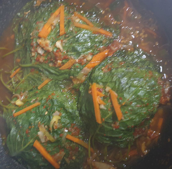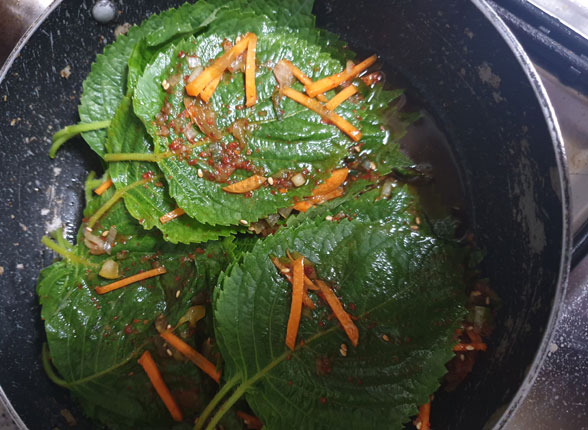 냄비에 양념장 바른 깻잎을 넣고 냄비뚜껑을 덮은 상태에서 5분간 쪄준다.