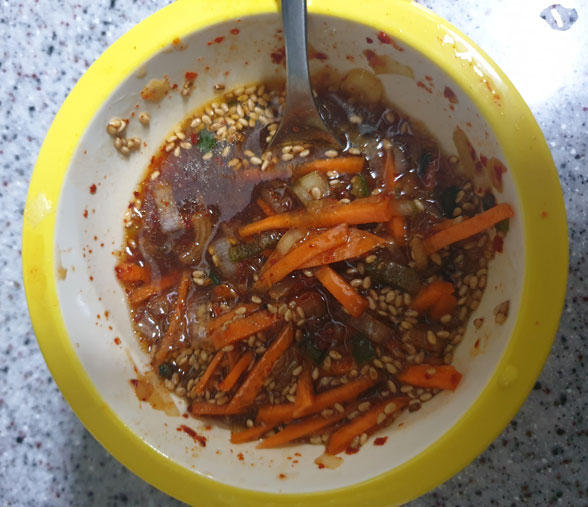 진간장, 멸치액젓, 맛술, 고춧가루, 다진파, 당근, 다진마늘, 들기름, 물, 통깨를 섞어 양념장을 만든다.