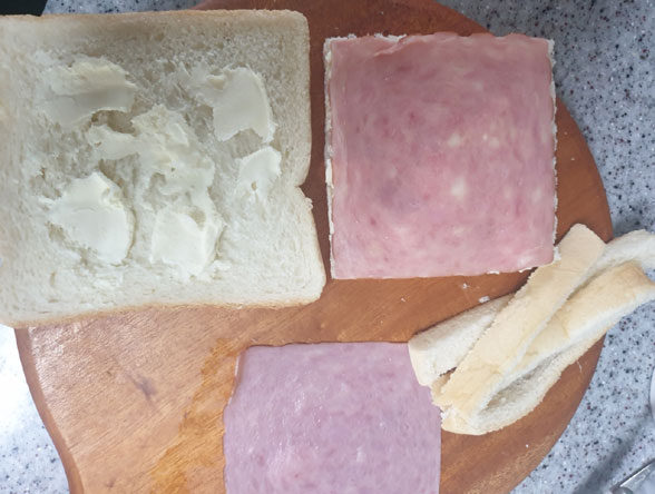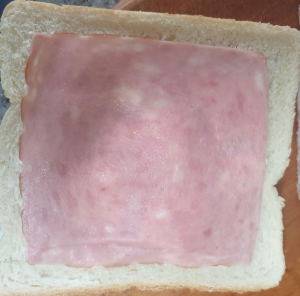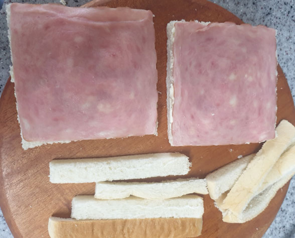 필라델피아치즈를 바른 면 위에 슬라이스햄을 올려놓고 슬라이스햄에 맞게 식빵 끝들을 잘라준다.