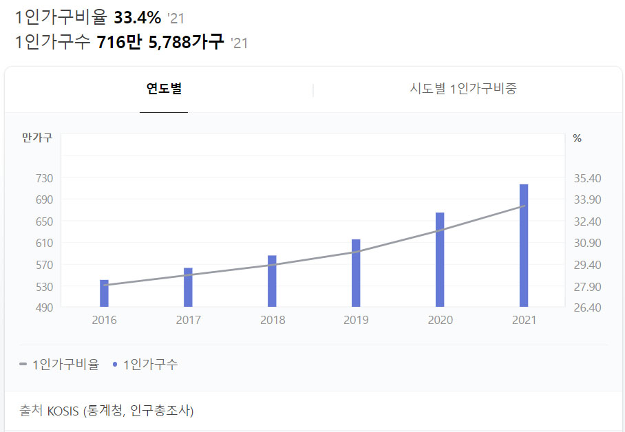 통계청 자료에 의하면 2021년 1인가구비율은 33.4%, 가구수도 716만에 이른다.