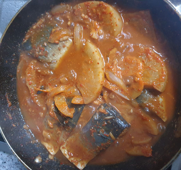 오목한 냄비에 무를 깔고, 위에 고등어를 올리고 그 위에 양파를 흩뿌린다.