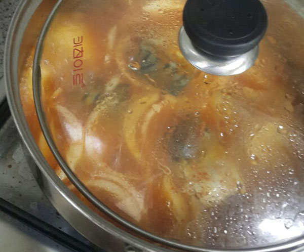 뚜껑을 닫고 중불에 끓이다가 어느 정도 끓으면 뚜껑을 살짝 열어서 넘치지 않게 해놓고 약불에 졸인다.